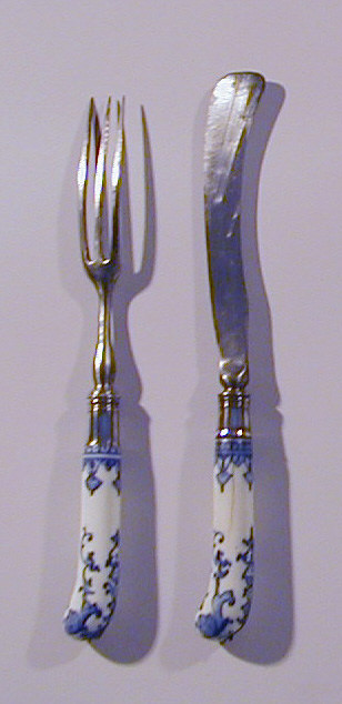 Fork with Porcelain Handle Fork; Manufactured by Saint-Cloud Porcelain Manufactory (France); France; soft paste porcelain, vitreous enamel, steel, silver; L x W x D: 20.8 × 2 × 1.6 cm (8 3/16 × 13/16 × 5/8 in.); The Robert L. Metzenberg Collection, gift of Eleanor L. Metzenberg; 1985-103-226