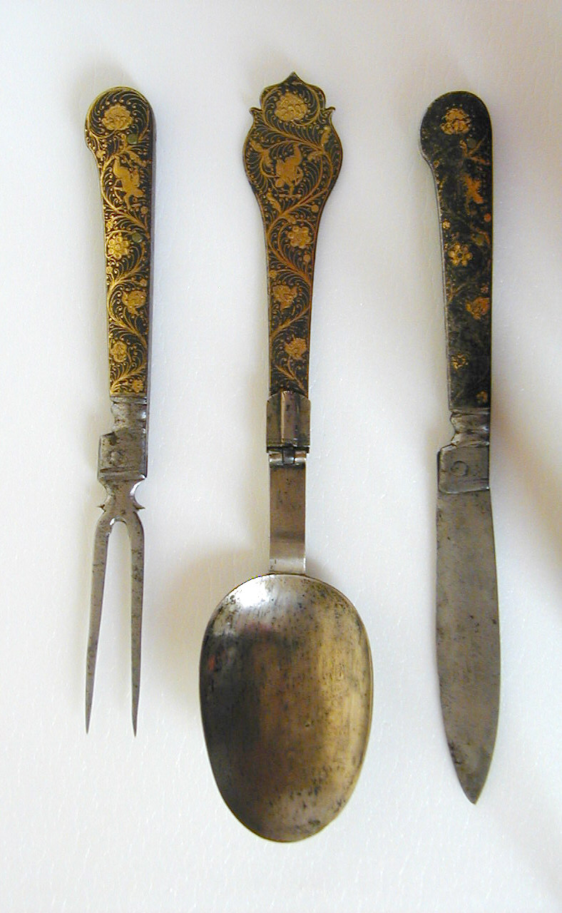 This is a Folding fork. It was manufactured by FGS. It is dated ca. 1700 and we acquired it in 1985. Its medium is steel, gold, brass. It is a part of the Product Design and Decorative Arts department.
