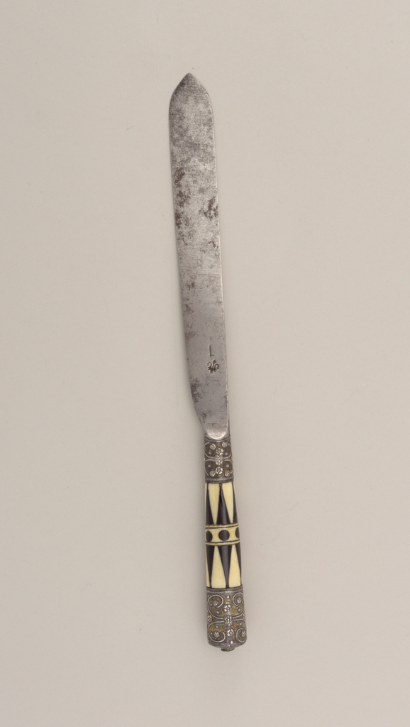 Knife with Triangular Pattern Ivory and Bone Handle Knife; Manufactured by London Cutler's Company; England; steel, silver, gold, ivory, bone; L x W x D: 22.5 × 1.7 × 1.7 cm (8 7/8 × 11/16 × 11/16 in.); The Robert L. Metzenberg Collection, gift of Eleanor L. Metzenberg; 1985-103-85