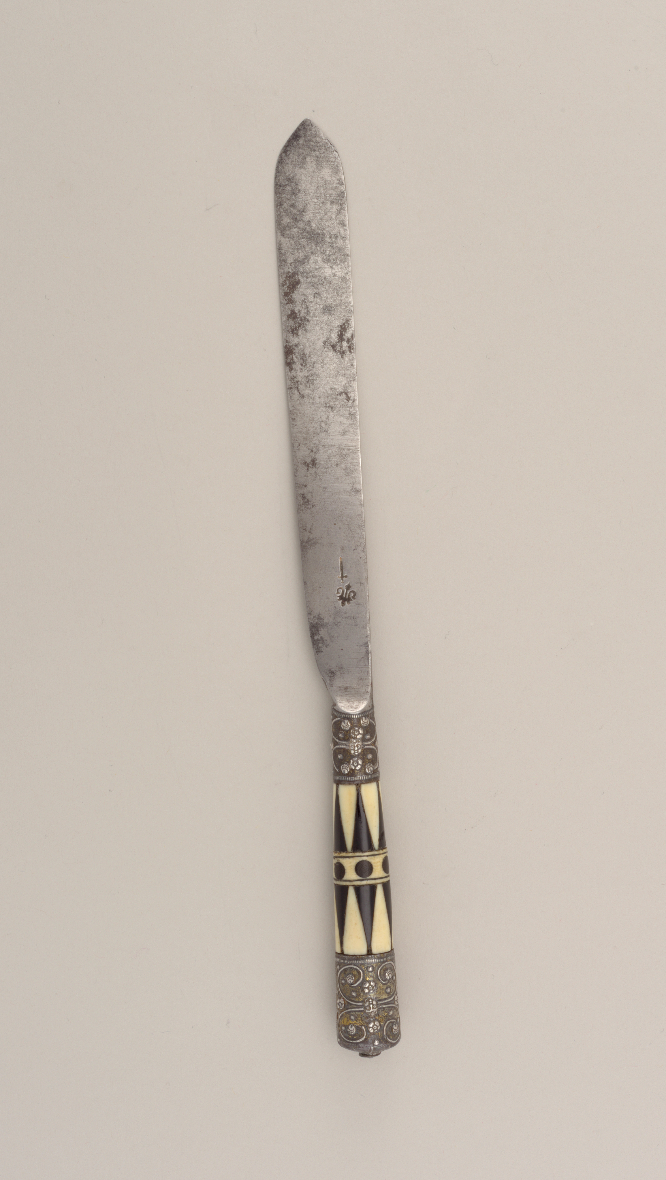 This is a knife. It was manufactured by London Cutler's Company. It is dated ca. 1610 and we acquired it in 1985. Its medium is steel, silver, gold, ivory, bone. It is a part of the Product Design and Decorative Arts department.
