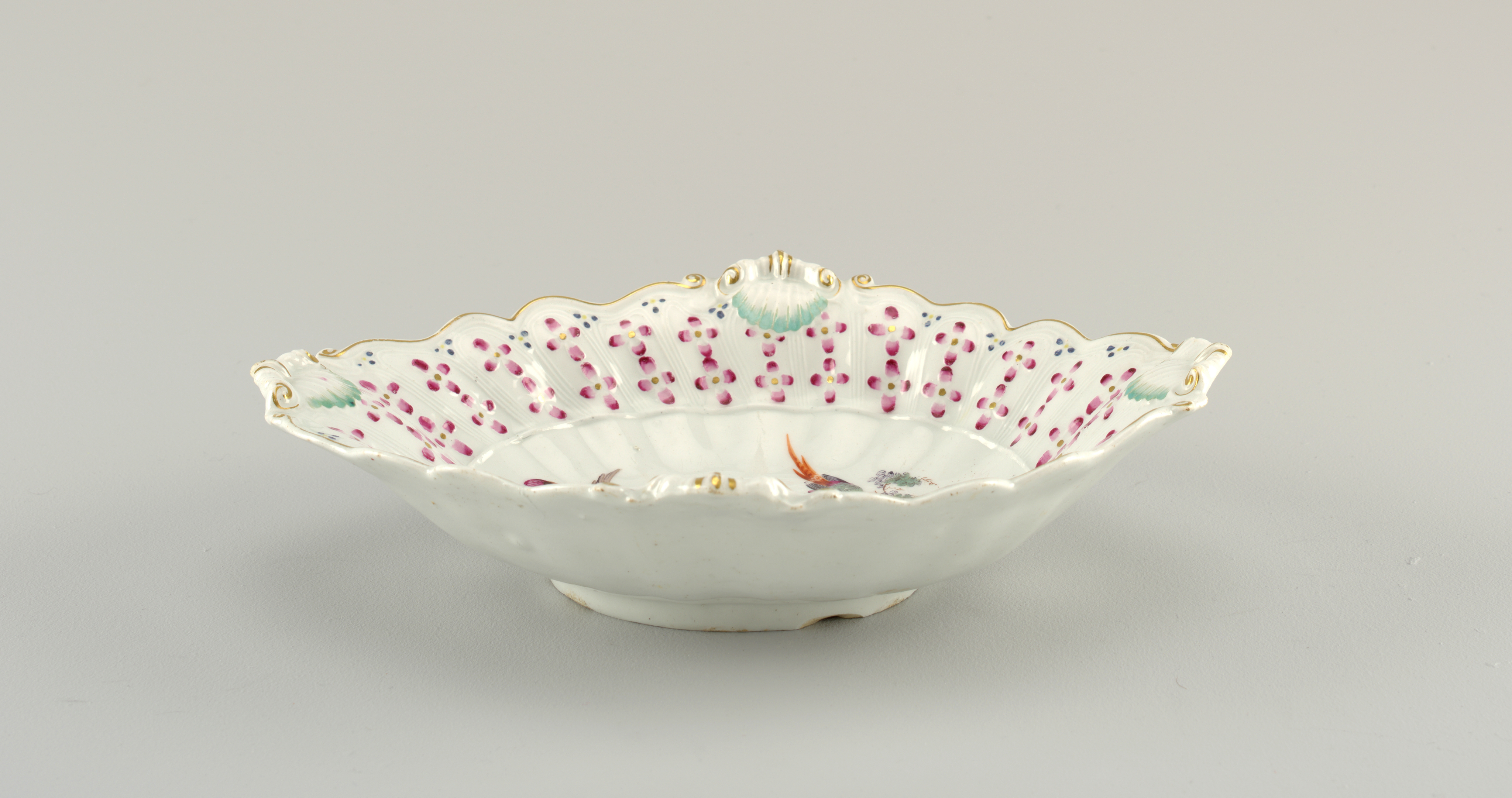 This is a platter. It was manufactured by Derby Porcelain Factory. It is dated ca. 1760 and we acquired it in 1985. Its medium is soft paste porcelain, vitreous enamel, gold. It is a part of the Product Design and Decorative Arts department.