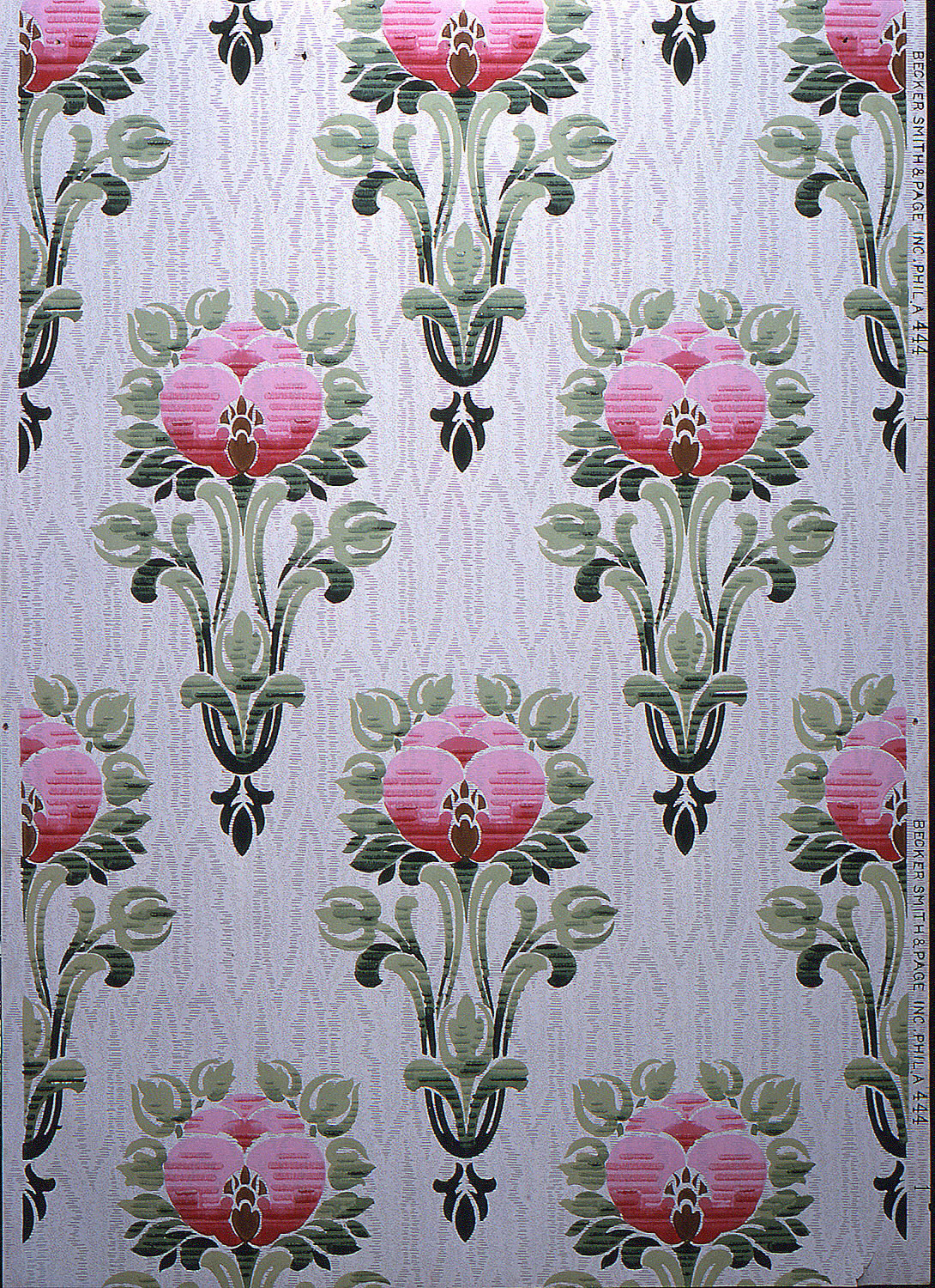 This is a Sidewall - sample. It was manufactured by Becker, Smith & Page, Inc.. It is dated 1906–07 and we acquired it in 1985. Its medium is machine-printed. It is a part of the Wallcoverings department.