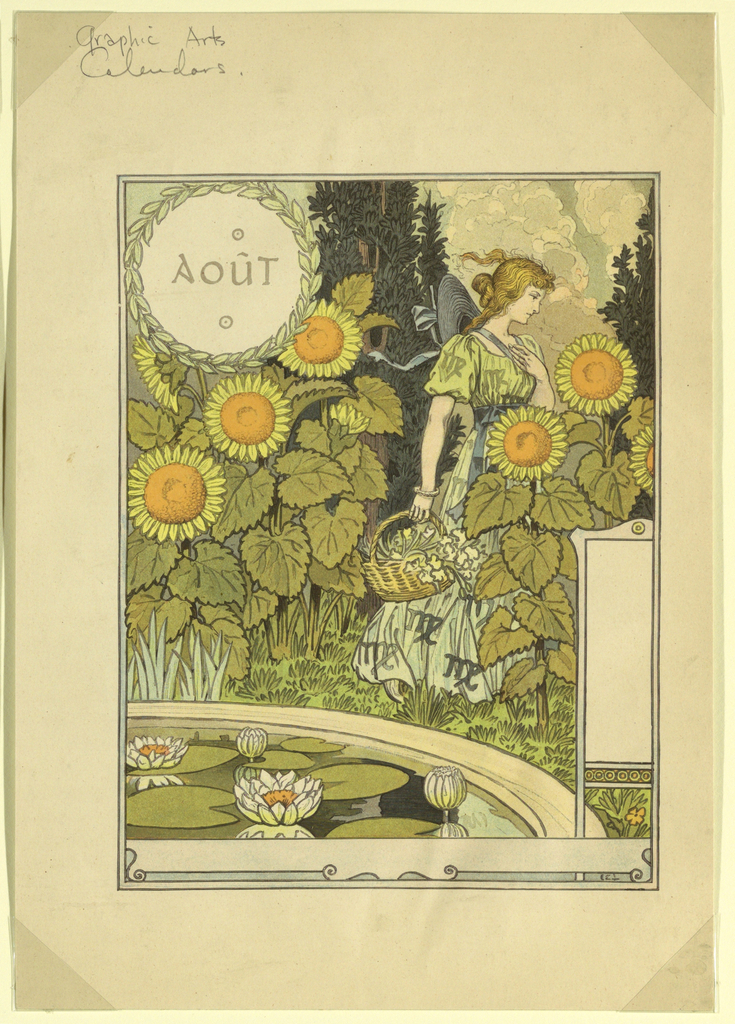 Print, August, from La Belle Jardinière; Designed by Eugène Samuel Grasset (Swiss, 1841 – 1917; active Paris, France 1871–1917); France; chromotypograph; H x W: 27.8 x 20.5 cm (10 15/16 x 8 1/16 in.); Gift of Unknown Donor; 1985-28-1-4