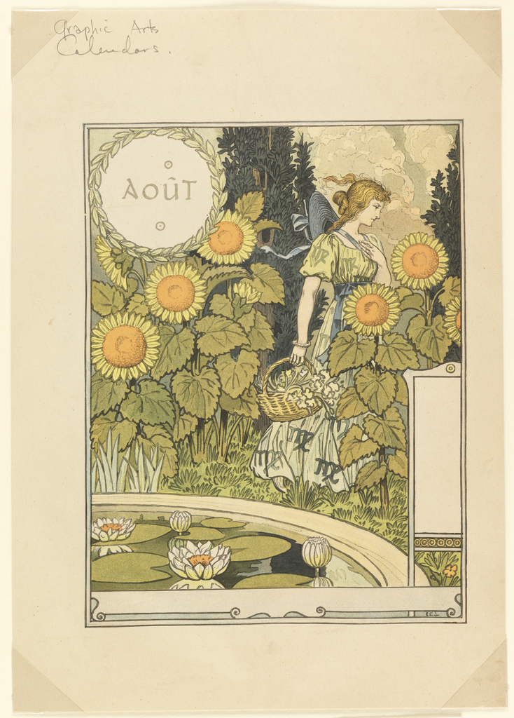 Print, August, from La Belle Jardinière; Designed by Eugène Samuel Grasset (Swiss, 1841 – 1917; active Paris, France 1871–1917); France; chromotypograph; H x W: 27.8 x 20.5 cm (10 15/16 x 8 1/16 in.); Gift of Unknown Donor; 1985-28-1-4