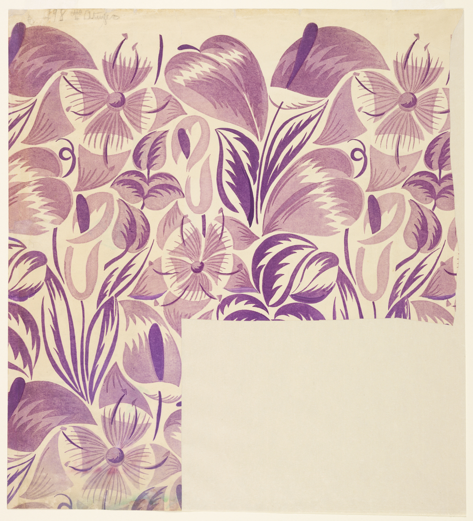 Drawing, Textile Design: Tropical Flowers; Designed by Raoul Dufy (French, 1877–1953); Manufactured by Bianchini-Férier, Inc. (France); France; three colors, printed proof; 60.6 x 55.4 cm (23 7/8 x 21 13/16 in.), irregular; Museum purchase from General Acquisitions Endowment and Friends of Drawings and Prints Funds; 1985-50-5