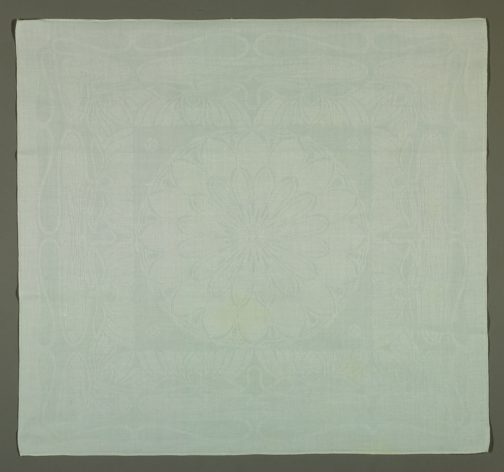 This is a Napkin. It was designed by Chris Lebeau and manufactured by E.F.J. Van Dissel and Son. It is dated ca. 1925 and we acquired it in 1985. Its technique is 4 & 1 damask. It is a part of the Textiles department.