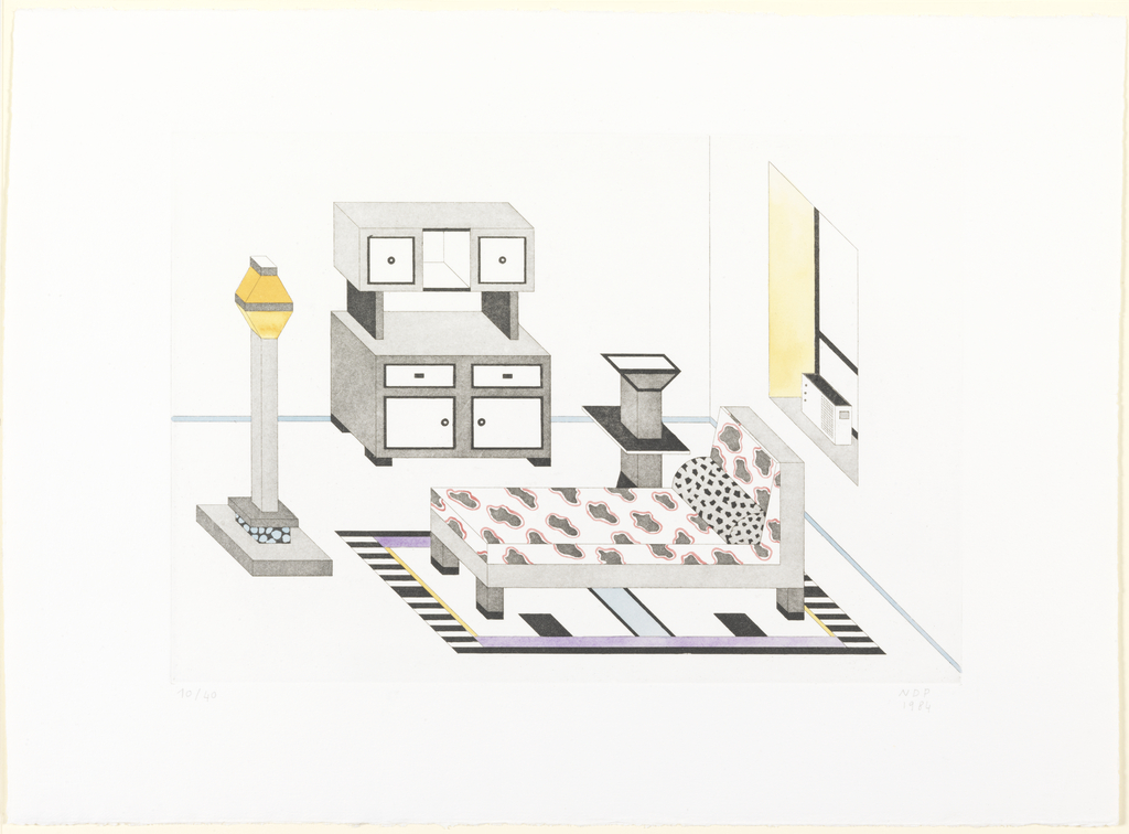 Print, Bedroom; Designed by George J. Sowden (British, b. 1942); Italy; aquatint, brush and watercolor on white wove paper; H x W: 51 x 69.5 cm (20 1/16 x 27 3/8 in.); Gift of Nathalie du Pasquier and George J. Sowden; 1985-69-2