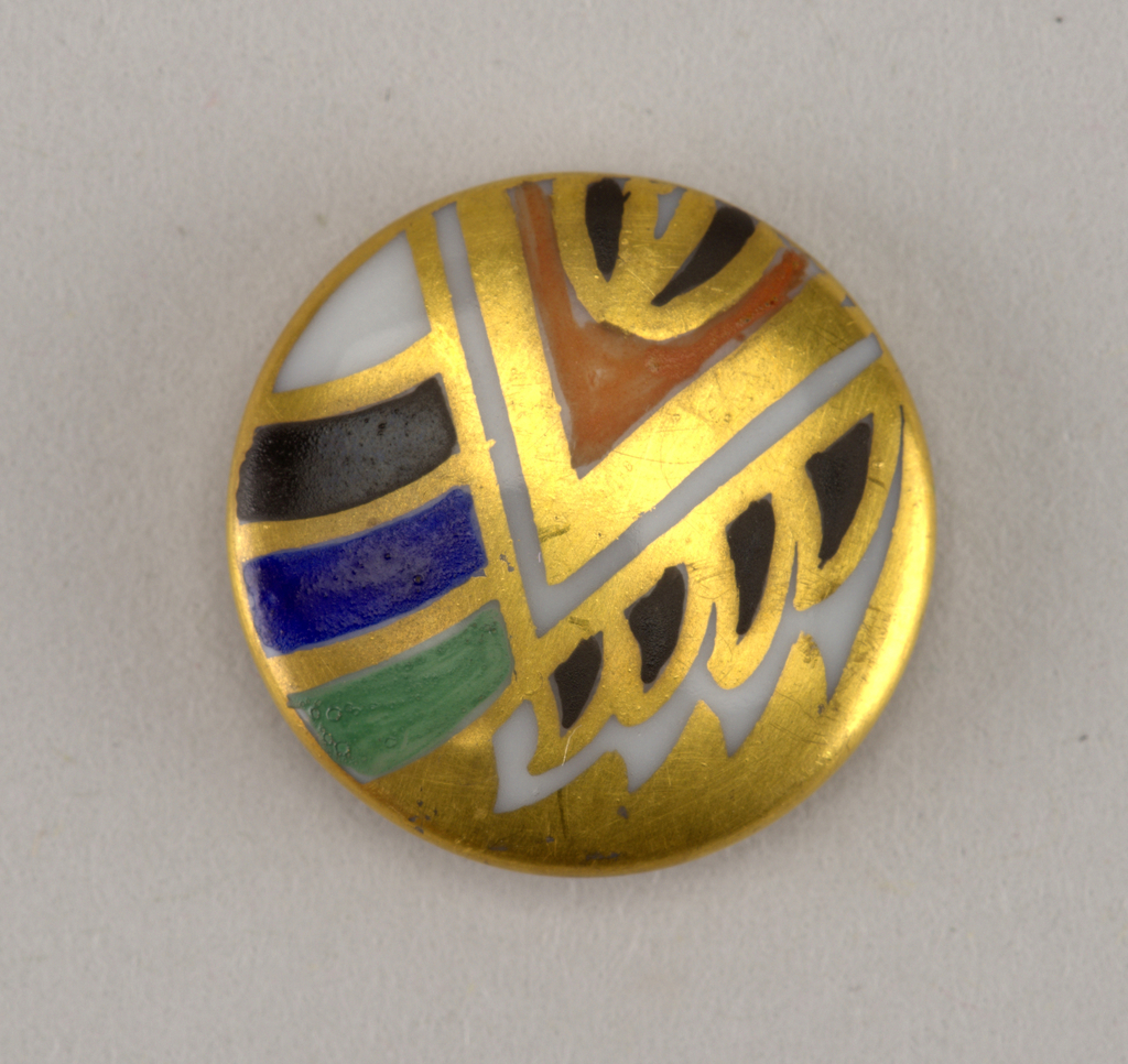 This is a Button. It was designed by Simon Lissim. It is dated ca. 1930 and we acquired it in 1985. Its medium is porcelain, enamel, gilding. It is a part of the Product Design and Decorative Arts department.