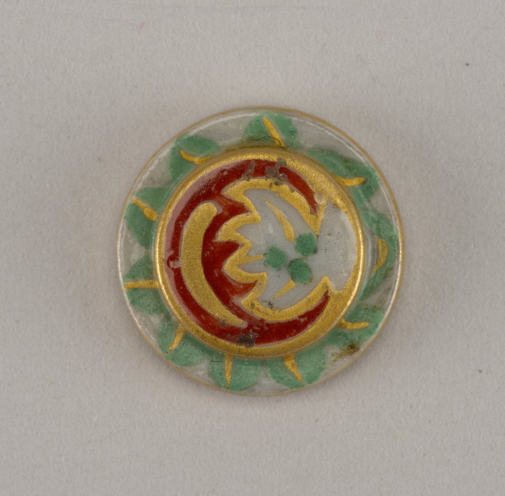 This is a Button. It was designed by Simon Lissim. It is dated ca. 1930 and we acquired it in 1985. Its medium is porcelain, enamel, gilding. It is a part of the Product Design and Decorative Arts department.