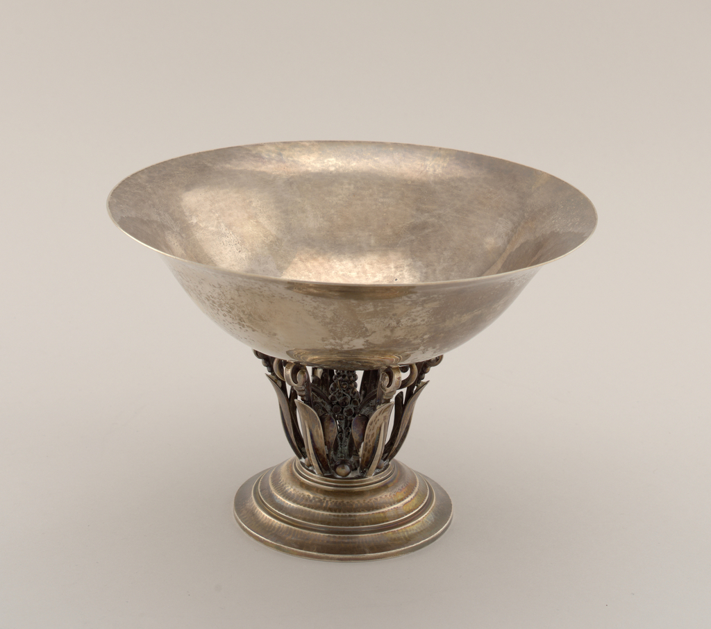 Marks: Stamped on underside of foot: "[factory mark of G. Jensen in a beaded cir- cle beneath crown] / STERLING / 242 / DENMARK / GJ 925 S in a beaded oval."Unidentified mark of a figure in beaded circle, with scratched "CF"