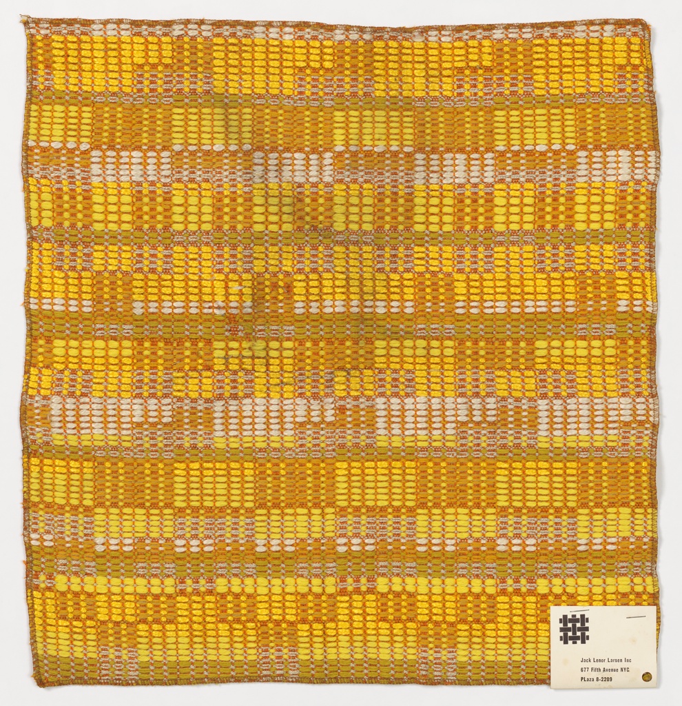 This is a Sample. It was designed by Jack Lenor Larsen and produced by Jack Lenor Larsen Incorporated. It is dated 1962–1967 and we acquired it in 2019. Its medium is 53% wool, 18% nylon, 15% rayon, 14% silk. It is a part of the Textiles department.