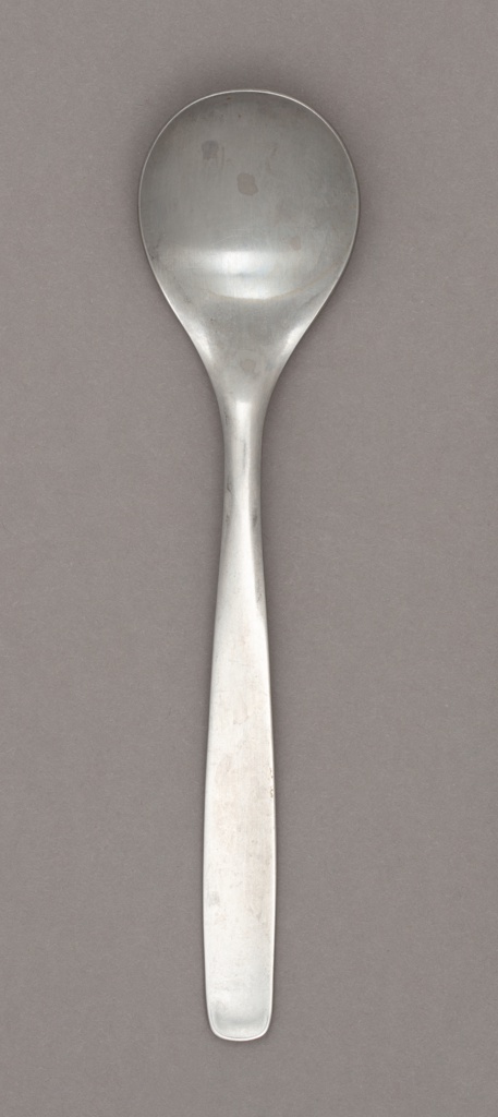 This is a spoon. It was designed by Russel Wright and manufactured by John Hull Cutlers Corporation. It is dated designed 1948 and we acquired it in 2019. Its medium is forged stainless steel. It is a part of the Product Design and Decorative Arts department.