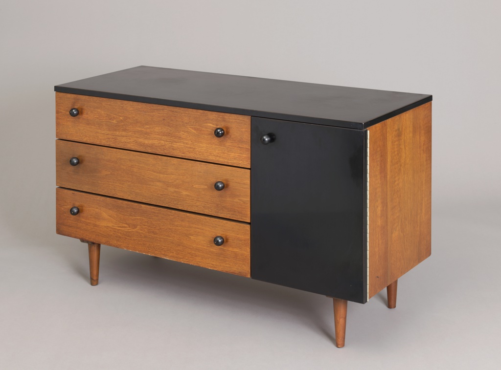 Buffet Buffet; Designed by Greta Magnusson Grossman (American, born Sweden, 1906 – 1999); Manufactured by Glenn of California (American); walnut, thermoset plastic, metal; H x W x D: 72.1 × 118.6 × 47.6 cm (28 3/8 × 46 11/16 × 18 3/4 in.); Museum purchase through the American Women's History Initiative Acquisitions Pool, administered by the Smithsonian Women's History Initiative and from General Acquisitions Endowment Fund; 2020-14-4