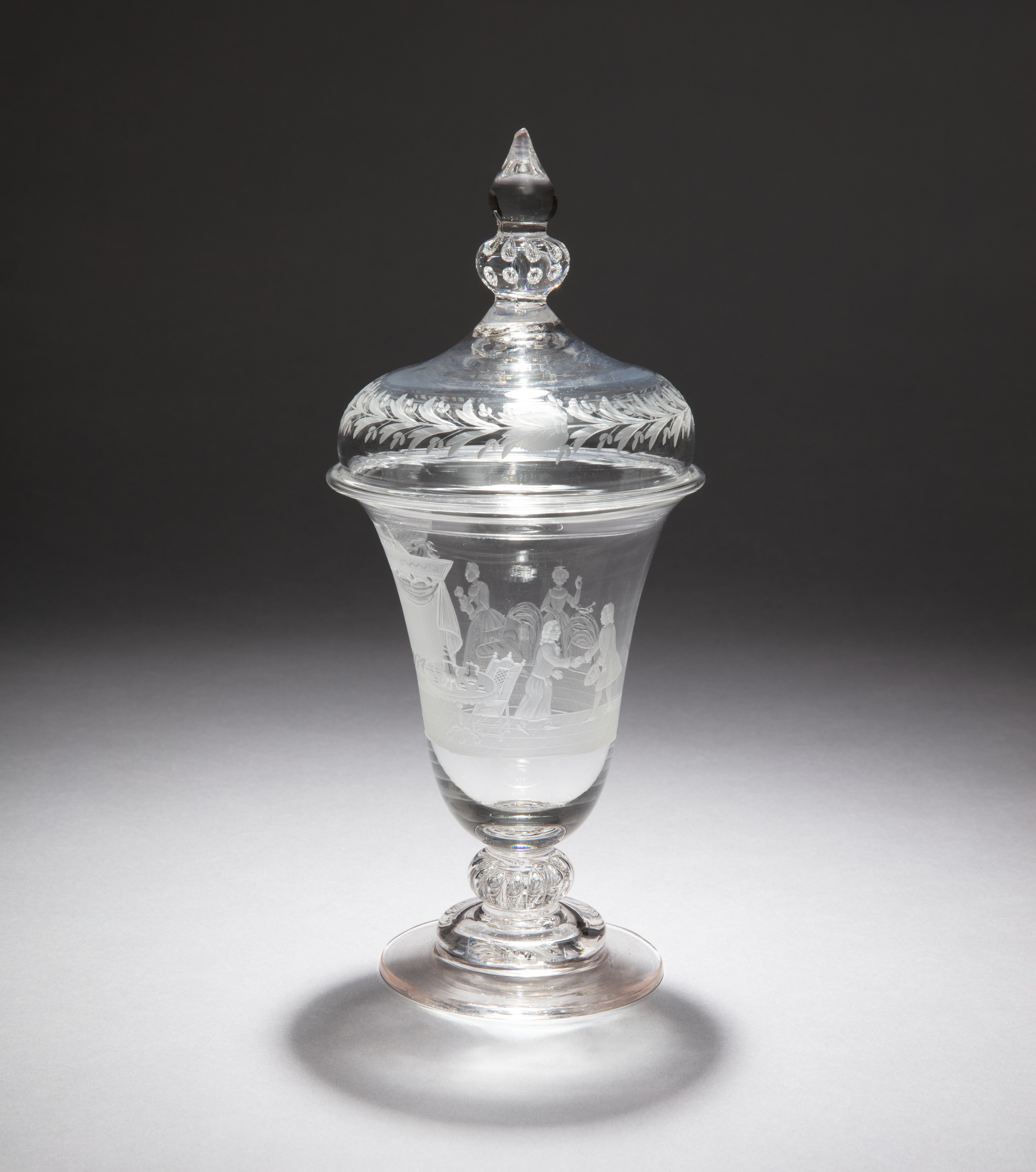 This is a drinking glass and cover. It is dated ca. 1760 and we acquired it in 2021. Its medium is lead glass. It is a part of the Product Design and Decorative Arts department.