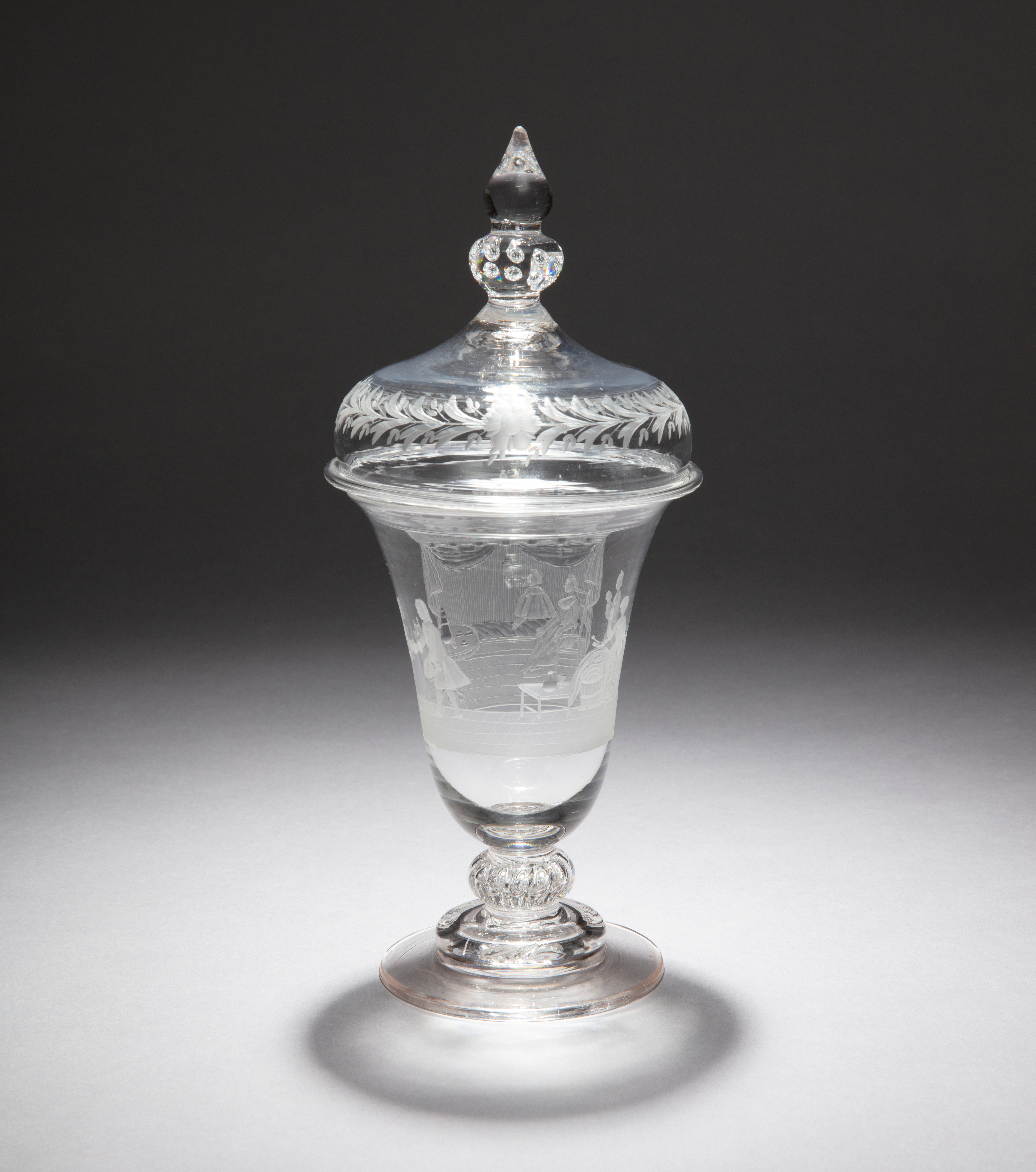 This is a drinking glass and cover. It is dated ca. 1760 and we acquired it in 2021. Its medium is lead glass. It is a part of the Product Design and Decorative Arts department.