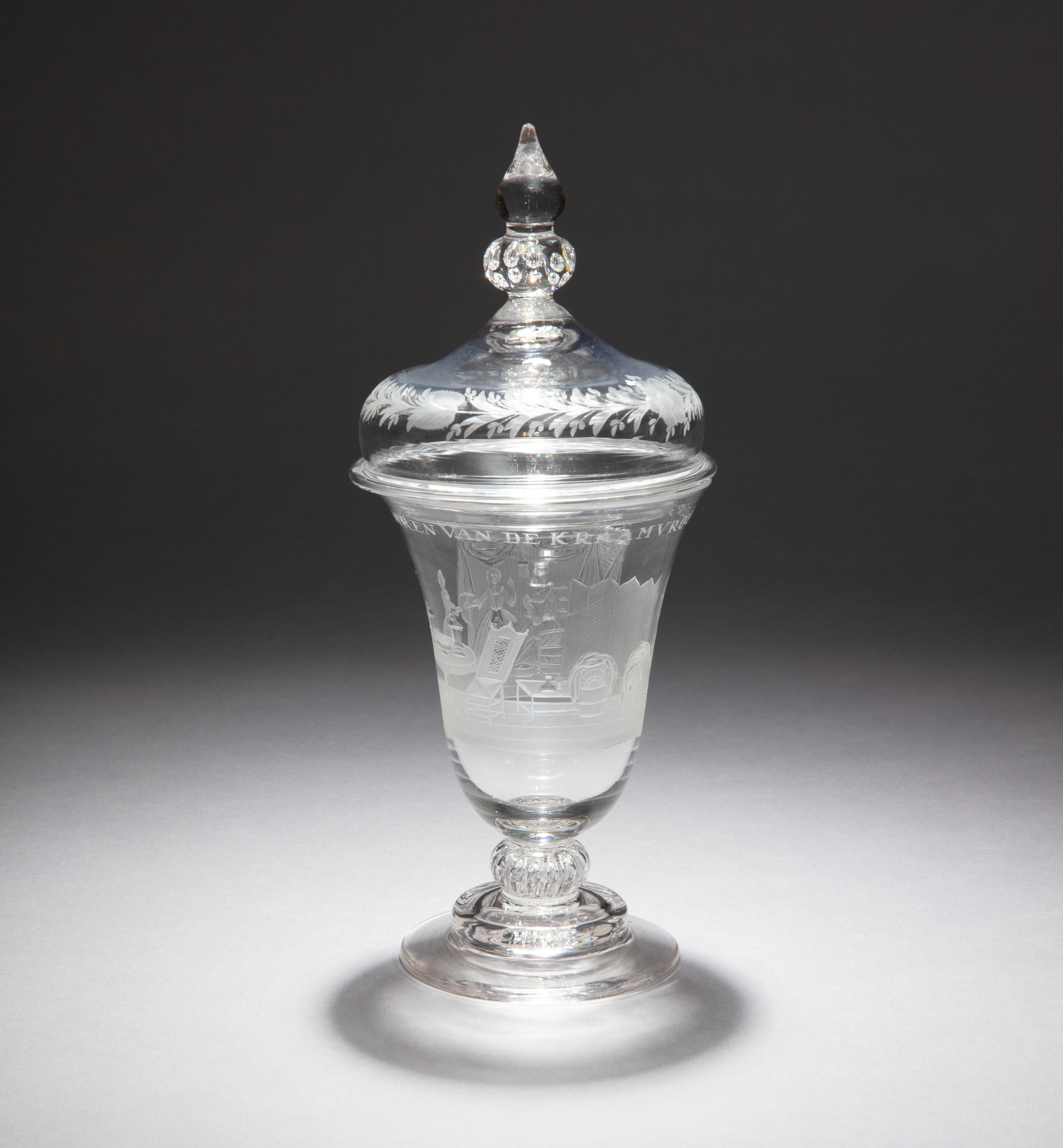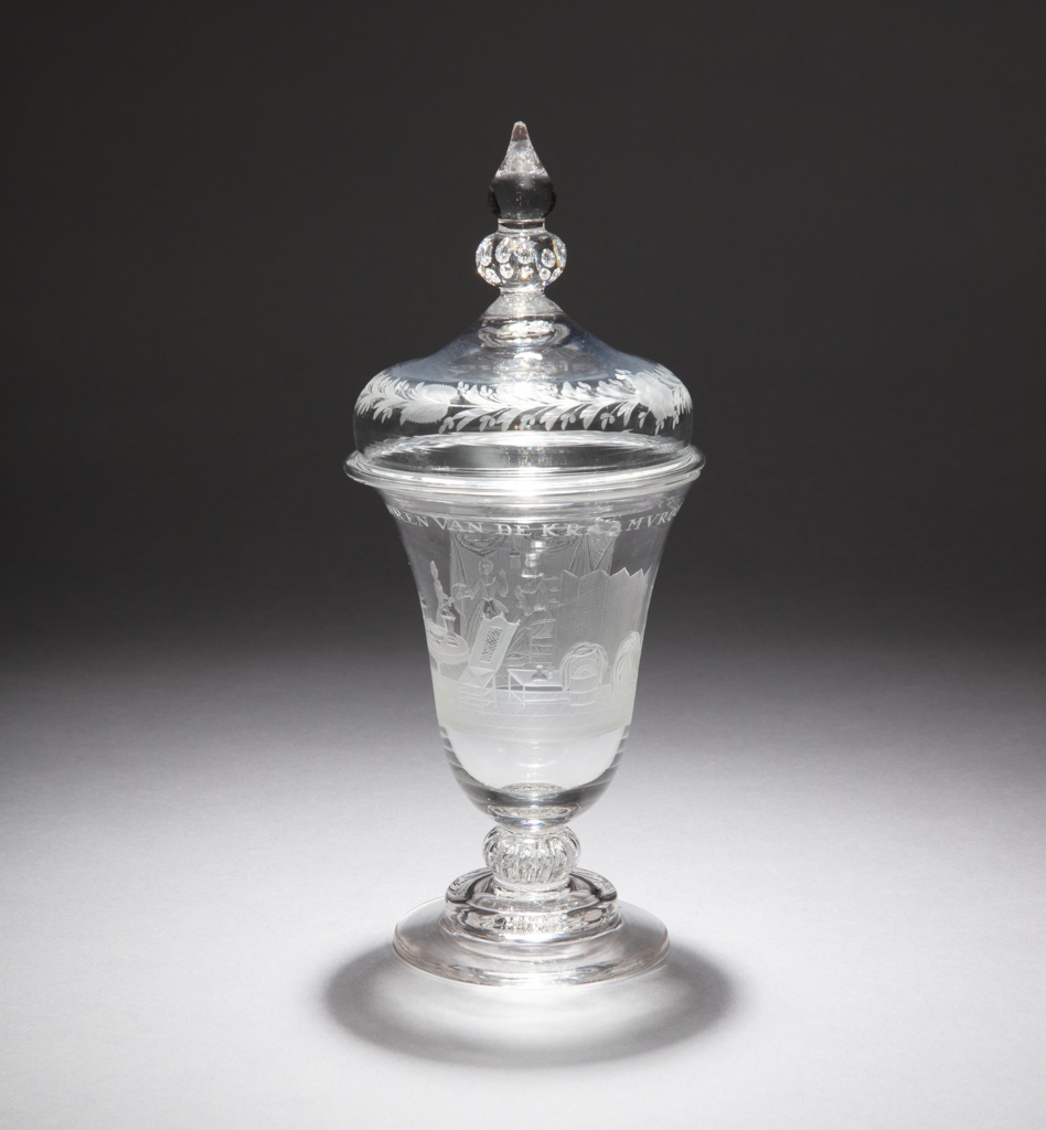 This is a drinking glass and cover. It is dated ca. 1760 and we acquired it in 2021. Its medium is lead glass. It is a part of the Product Design and Decorative Arts department.