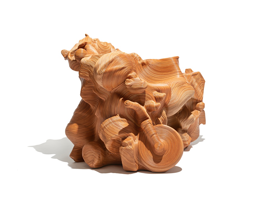 Jay Sae Jun Oh’s furniture design mines her biographical experience and remixes traditional craft techniques to comment on cultural values and environmental responsibilities. This armchair is composed of found household objects and discarded everyday items, ranging from a plastic tricycle to water bottles, that are laboriously hand-wrapped in leather cord. Oh considers the final product a type of self-portrait.