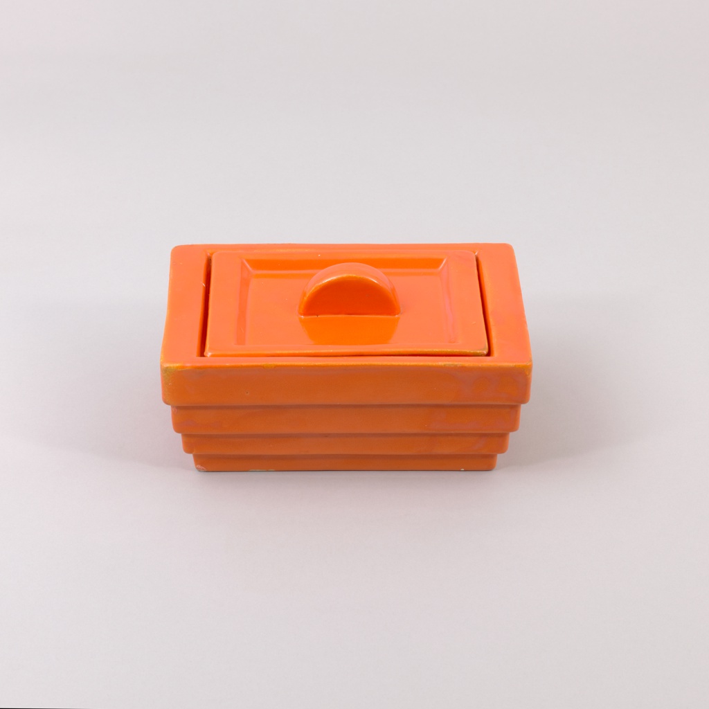 This is a Box. It was designed by Eva Zeisel and manufactured by Schramberger Majolikafabrik. It is dated 1931 and we acquired it in 2024. Its medium is earthenware. It is a part of the Product Design and Decorative Arts department.