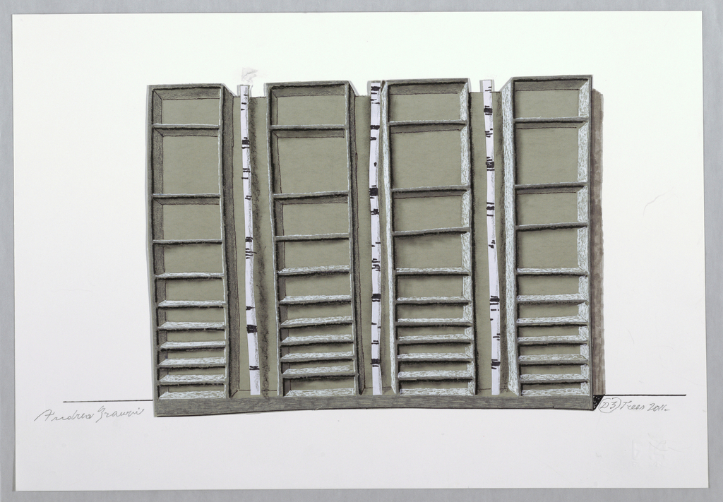 For the Trees & Stones exhibition, Branzi produced furniture to bring the natural world into the gallery environment. The D3 Trees series combines parts of birch trees with grid-like metal and wood shelves and frames. A presentation drawing and design sketches document the series. The presentation drawing (2013-24-3) shows four vertical bookcases set against a back frame with a birch tree trunk positioned vertically between each case. The space between the cases is wide enough to give breadth and independence to the three birch trunk elements, each of which rises marginally higher than the cases and lends a balance and harmony to Branzi’s design. Two graphite drawings depict alternative preparatory sketches for the D3 Trees series (2013-24-1 and 2013-24-2).