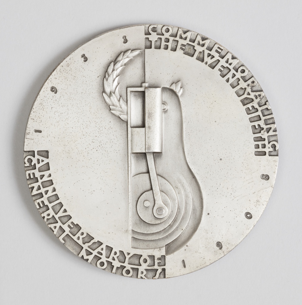 Medal Commemorating the Twenty-Fifth Anniversary of General Motors, 1908-1933 Medal; Designed by Norman Bel Geddes (American, 1893–1958); Modeled by René Paul Chambellan (American, 1893–1955); Manufactured by Medallic Art Company; silver-plated brass; H x diam.: ? x 7.6 cm (3 in.); Gift of George R. Kravis II; 2018-22-27