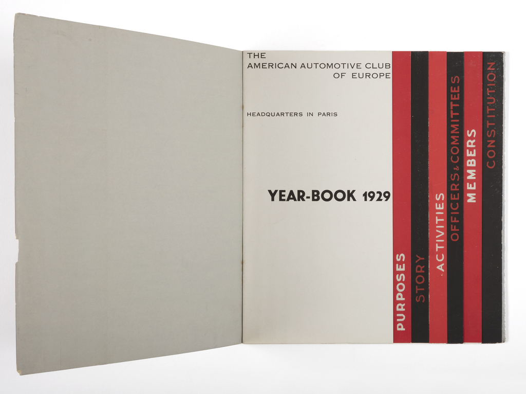 The American Automobile Club of Europe was founded in 1925 by a group of fifteen American automobile executives who were based throughout Europe. The executives were focused on promoting the emerging markets for American-made automobiles, and felt that a professional organization would help support them. Headquartered in Paris, the group’s mission is outlined in this publication, which was designed by French graphic designer Jean Carlu: “To bring together the men in Europe who represent American manufacturers in all branches of the automotive industry. To act as a clearing house for information of mutual interest to its members, and to study questions which affect their operations. To entertain visitors to Europe who are connected with the automotive industry in America.” Carlu’s publication design features a striking logo, layering the acronym lettering of the club in an Art Deco style. The cover is constructed of a silver-coated ridged cardboard, a visual nod to the corrugated metal that was popular in industrial production.