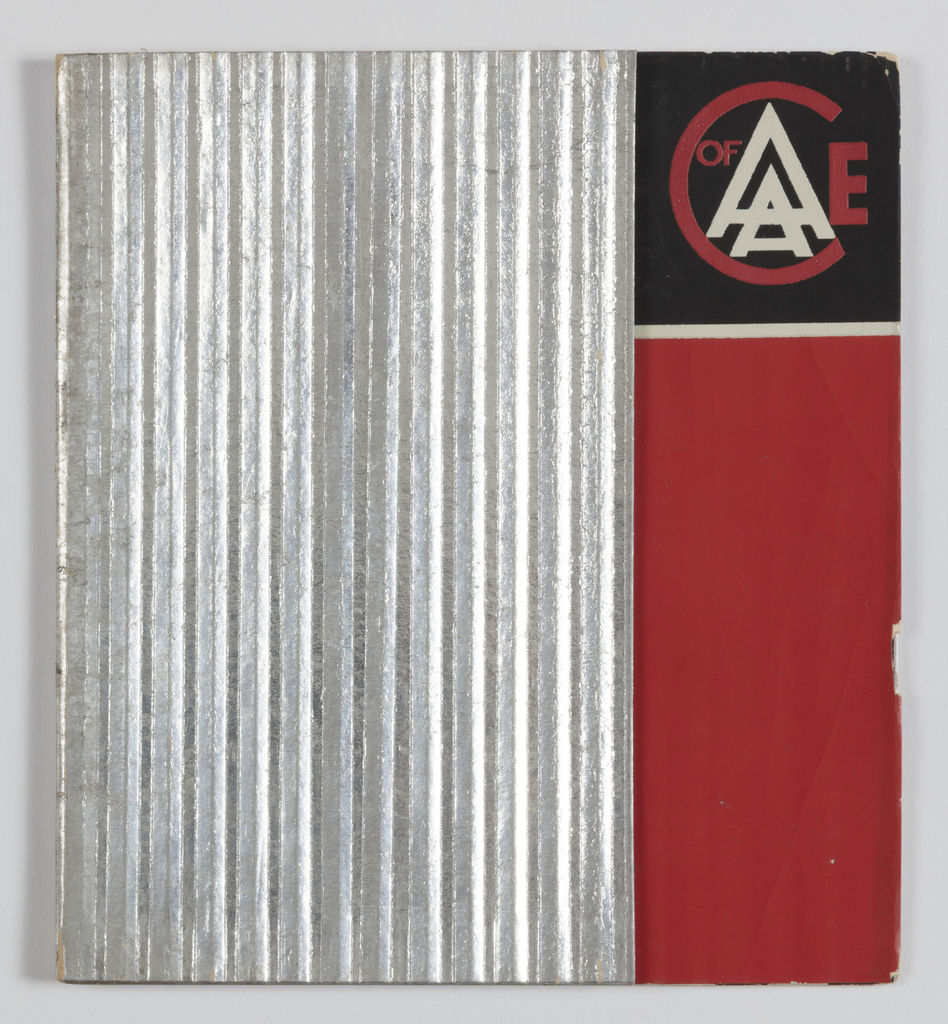 The American Automobile Club of Europe was founded in 1925 by a group of fifteen American automobile executives who were based throughout Europe. The executives were focused on promoting the emerging markets for American-made automobiles, and felt that a professional organization would help support them. Headquartered in Paris, the group’s mission is outlined in this publication, which was designed by French graphic designer Jean Carlu: “To bring together the men in Europe who represent American manufacturers in all branches of the automotive industry. To act as a clearing house for information of mutual interest to its members, and to study questions which affect their operations. To entertain visitors to Europe who are connected with the automotive industry in America.” Carlu’s publication design features a striking logo, layering the acronym lettering of the club in an Art Deco style. The cover is constructed of a silver-coated ridged cardboard, a visual nod to the corrugated metal that was popular in industrial production.