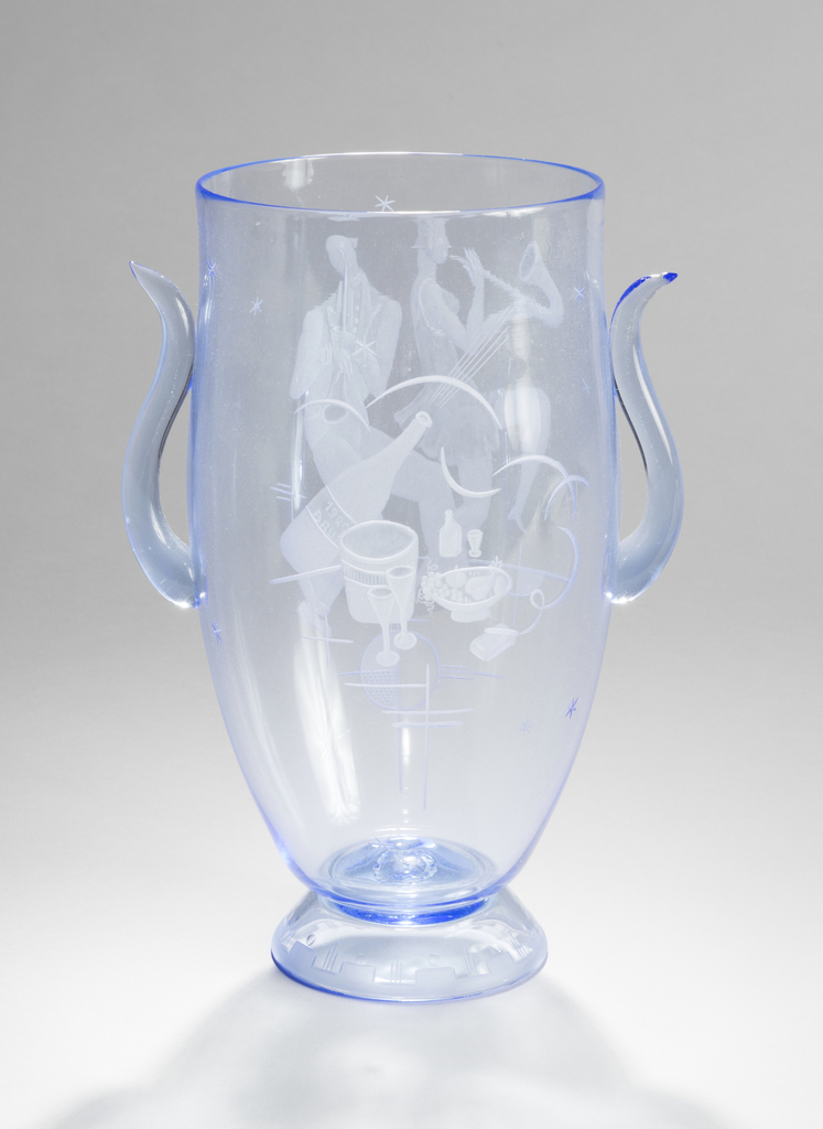 This is a Vase. It is dated ca. 1927 and we acquired it in 2015. Its medium is blown and engraved glass. It is a part of the Product Design and Decorative Arts department.