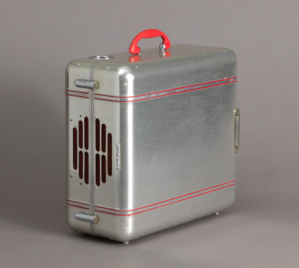 In 1933 designer John Vassos met a visiting RCA executive while he was working for WCAU, a flagship CBS radio station in Philadelphia. Vassos was hired to work on RCA’s radio lines but his contributions quickly expanded and he executed graphic design assignments including a new corporate logo and sales displays, transmitter architecture, and produced a range of other consumer products such as this phonograph, one of his most well-known designs. In addition to radios, phonographs were new electronic appliances that facilitated entertainment in the 1930s. This phonograph’s novelty derived from its potential for portability, allowing music to travel where electrical cords could not reach. Vassos’s choice of aluminum for the case was both practical and stylistic; the metal’s lightweight quality made it easier to transport while its sheen and gentle curves, offset with touches of smooth colored velvet, recalled automotive styling. The mirror located on the back of the player offered a visual as well as an audible musical experience; even those positioned away from the phonograph could have marveled at the power of the appliance as they watched a record spin around and around. Vassos intense interest in the psychology of consumers set him apart from other industrial designers of the period. Rather than alienating the consumer from the mechanical world, a fate that Vassos feared, here the designer has made the phonograph into an interactive experience that invites the user to engage with the machinery and watch its operation.