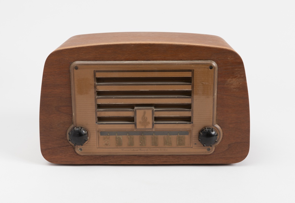 This is a radio. It was designed by Charles Eames and Ray Kaiser Eames and manufactured by Emerson Radio and Phonograph Corp.. It is dated 1940–49 and we acquired it in 2016. Its medium is bentwood, plastic. It is a part of the Product Design and Decorative Arts department.