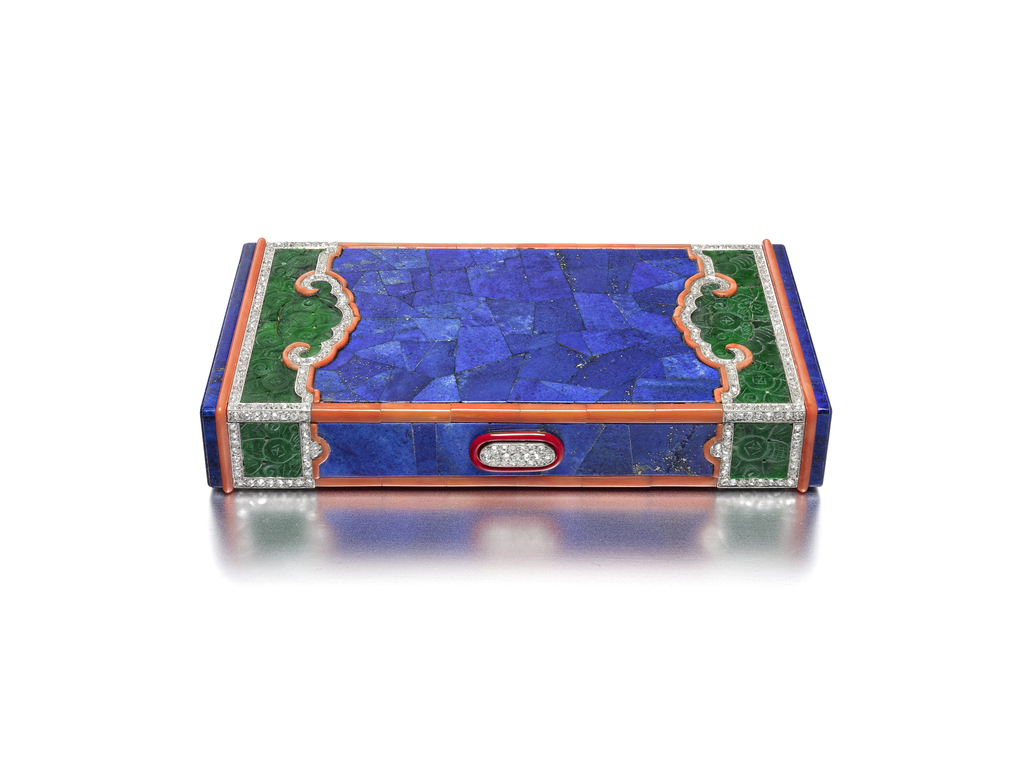 - lapis lazuli, enamel, carved jade, mother-of-pearl, diamonds, gold, platinum.