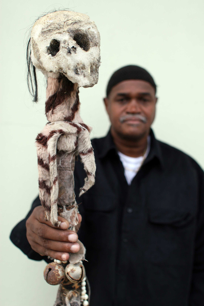 Ronald Lewis’s House of Dance and Feathers celebrates the oldest social aid and pleasure club in the Ninth Ward, the Big Nine Social Club, and Mardi Gras Indian tribes throughout New Orleans. The backyard museum was rebuilt to reconstruct a sense of history and identity and as a practical and cultural design resource for this unique culture after Hurricane Katrina destroyed the original location. The skull staff, a gift from a Creole Wild West member, now protects the site.