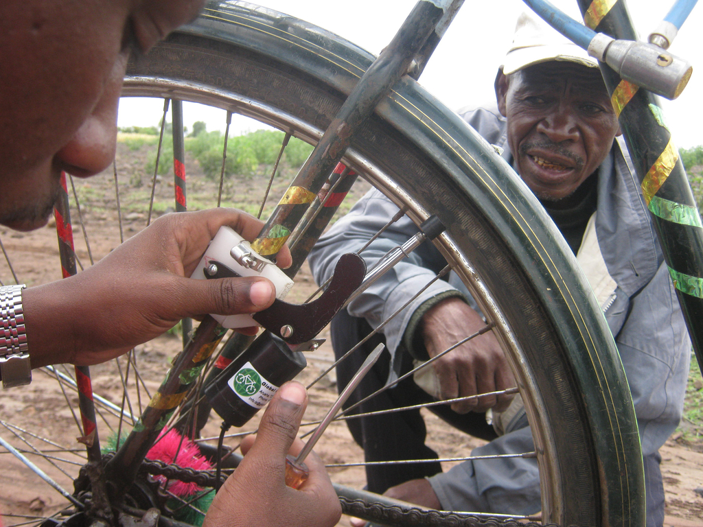 In Tanzania, the majority of people live without electricity, yet a third of the country uses mobile phones. Bernard Kiwia, a trained electrician and vocational-school instructor, collaborated with Global Cycle Solutions (GCS) to design a phone charger from scrap bike and radio parts. Made from spokes, brake tubes, clamps, motors, and capacitors, the device generates power when its roller comes in contact with the bike’s spinning wheel. Kiwia has also designed a phone charger that regulates the voltage coming from a motorbike’s battery to recharge the mobile phone. The bicycle charger costs approximately US$10 and the motorcycle charger approximately US$5.