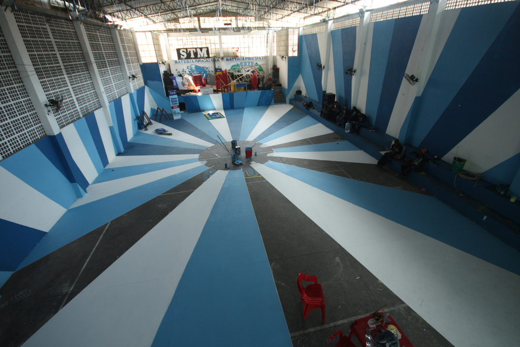 Favelas ring Rio de Janeiro’s hillsides, and many of their residents still experience clashes between police and gangs. Jeroen Koolhaas and Dre Urhahn, of the Dutch partnership Haas&Hahn, created the Favela Painting Project to bring art and beauty to the built environment. In 2010, they employed local youth to paint murals over 7,000 square meters (75,000 sq. ft.) of the public square, thirty-four surrounding houses, streets, and the interior of a popular samba studio in the Santa Marta settlement. The design for Praça Cantão uses a flexible concept of colorful rays, which can easily be expanded further throughout the favela.