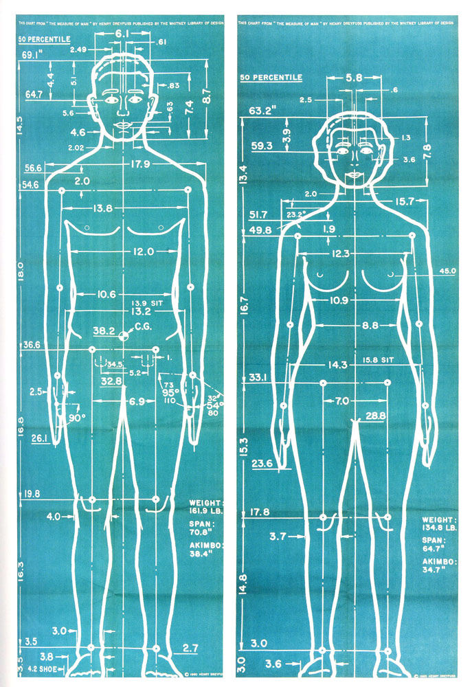 Design for human factors, also known as ergonomics, requires knowledge of bodily dimensions. Tilley created these famous drawings of typical Americans, affectionately known as “Joe” and “Josephine,” based on data used by the United States military (for men) and the fashion industry (for women), from which Tilley was able to determine a range of percentiles from 1 to 100. Joe and Josephine represent the mean (50th percentile).
