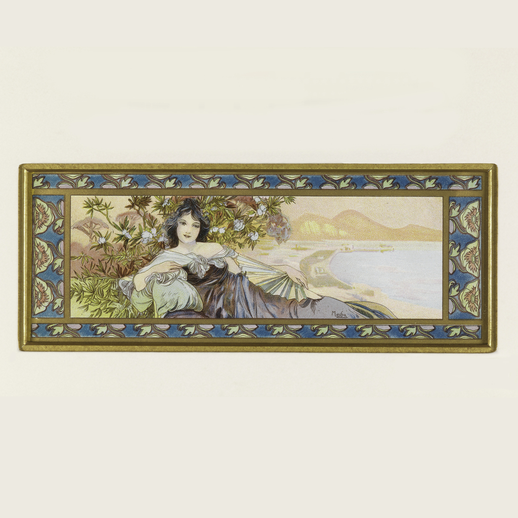 This set of three lithographed panels was one of Alphonse Maria Mucha’s designs for Lefèvre-Utile biscuit packaging. Mucha had a long relationship with Lefèvre-Utile, a French biscuit company founded in Nantes in 1846. Beginning in the 1880s, Lefèvre-Utile commissioned well-known artists to design their packaging and advertising. In 1896, Mucha was commissioned to create posters for the company. He was the first designer to use the company’s initials, LU, as a decorative motif, which he did in his design for the company’s 1897 calendar. The abbreviation proved so popular that the company subsequently formally took up the moniker. Around the turn of the century, Mucha was tasked with designing LU’s packaging designs and a brand identity. Mucha’s designs reflect a particular sensitivity to the shape of the packaging and the pleasant natures of its contents—Mucha’s signature languorous women, along with the use of a consistent font and logo, reinforced LU’s brand identity and transformed the package into its own publicity.