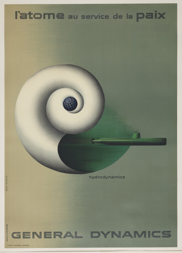 Poster, Hydrodynamics, L'Atome au Service de la Paix (Atoms for Peace); Designed by Erik Nitsche (Swiss, 1908–1998); Printed by Lithos R. Marsens; Client: General Dynamics Corporation (United States); Switzerland; offset lithograph on paper mounted on canvas; 126.5 × 89 cm (49 13/16 × 35 1/16 in.) Mount: 133 × 95.2 cm (52 3/8 × 37 1/2 in.); Gift of Arthur Cohen and Daryl Otte in memory of Bill Moggridge; 2013-42-9