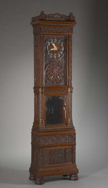 This is a Tall Clock. It was designed by Tiffany & Co. and Lockwood de Forest and retailed by Tiffany & Co.. It is dated ca. 1880. Its medium is mahogany, carved teak with dial faces of gilded and patinated metal, glass.
