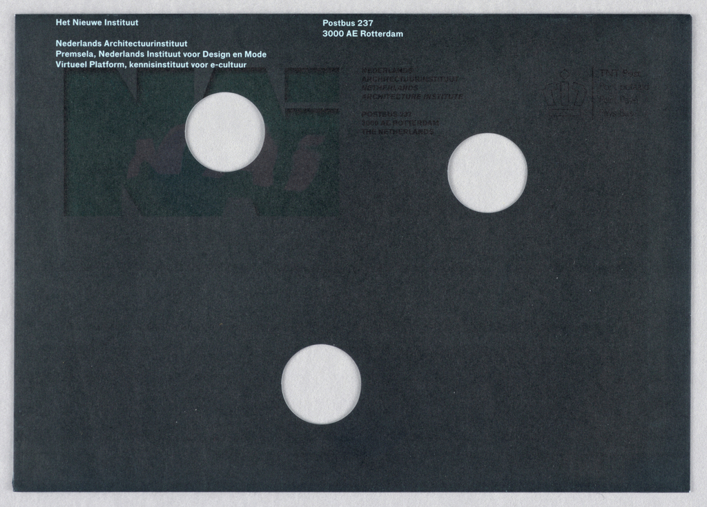 When Martens is asked how much do you need to represent something, his answer is "no more than necessary." What drives his work is sparsity, limitation, constraint. This attitude is perfectly expressed in the interim identity he designed for the New Institute (launched 2013), which combines three existing institutions: The Netherlands Architecture Institute (NAI); Premsela, The Netherlands Institute for Design and Fashion; and Virtueel Platform, for e-culture. With no money available for the intervention, Martens took the graphic identity designed by Bruce Mau for the Netherlands Architecture Institute (represented in the CHNDM collection, 2000-43-1/13) and printed over it in black, allowing enough of the old identity to show through to reveal the history behind the project, and then punched or printed three holes in the paper or envelope to represent the united institutions. As the New Institute press release stated, "With Martens’ design, history is not only visible but it is also literally given a new layer, symbolizing a new mission and ambition." From the New Institute identity campaign, Mr. Martens is donating eighteen pieces. This campaign provides a nice process story, since it demonstrates the transition from the logo material prepared by Bruce Mau to the New Institute, allowing us to see how a company or non-profit adjusts a prior graphic design campaign given a change in mission or circumstance.