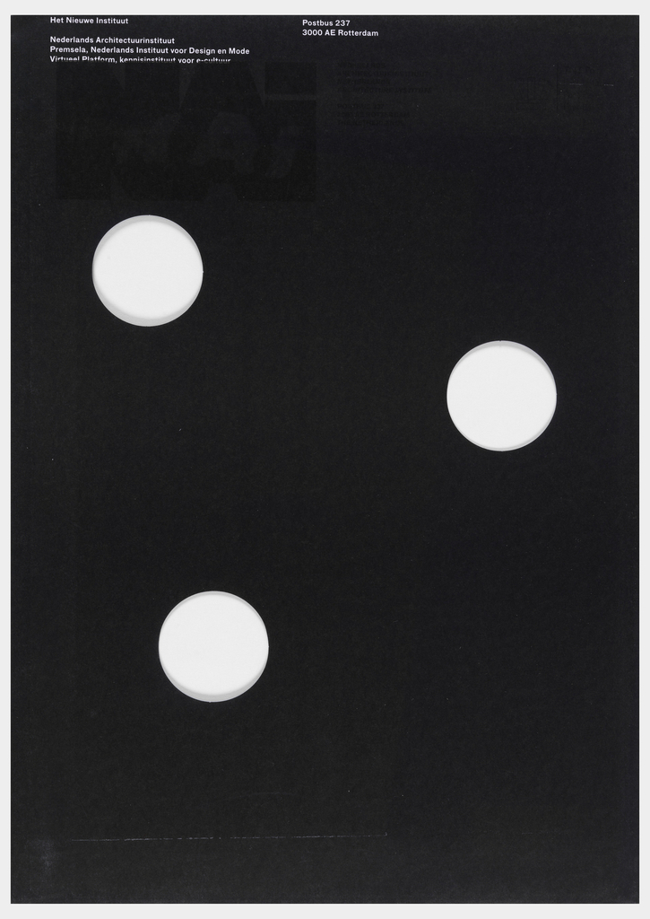 When Martens is asked how much do you need to represent something, his answer is "no more than necessary." What drives his work is sparsity, limitation, constraint. This attitude is perfectly expressed in the interim identity he designed for the New Institute (launched 2013), which combines three existing institutions: The Netherlands Architecture Institute (NAI); Premsela, The Netherlands Institute for Design and Fashion; and Virtueel Platform, for e-culture. With no money available for the intervention, Martens took the graphic identity designed by Bruce Mau for the Netherlands Architecture Institute (represented in the CHNDM collection, 2000-43-1/13) and printed over it in black, allowing enough of the old identity to show through to reveal the history behind the project, and then punched or printed three holes in the paper or envelope to represent the united institutions. As the New Institute press release stated, "With Martens’ design, history is not only visible but it is also literally given a new layer, symbolizing a new mission and ambition." From the New Institute identity campaign, Mr. Martens is donating eighteen pieces. This campaign provides a nice process story, since it demonstrates the transition from the logo material prepared by Bruce Mau to the New Institute, allowing us to see how a company or non-profit adjusts a prior graphic design campaign given a change in mission or circumstance.