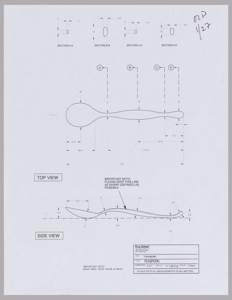 Print, Yamakazi Teaspoon; Designed by Eva Zeisel (American, b. Hungary, 1906–2011); USA; laser-printed white paper with annotations in red crayon, pen and black ink; 28 x 21.6 cm (11 in. x 8 1/2 in.); Gift of the Estate of Eva Zeisel; 2014-8-31