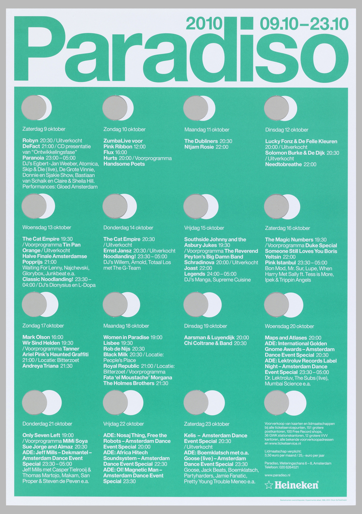In 2010, Experimental Jetset was asked to redesign a poster campaign that they had originally designed in 1996 for rock concert venue Paradiso. Paradiso has played a significant role in the Dutch rock- and counter-culture since its opening in 1968.