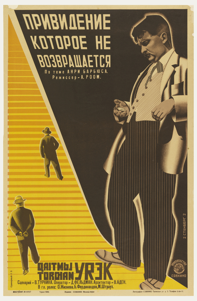 This poster advertises a Soviet film from 1929, The Ghost That Isn’t Returning, directed by Abram Room. Room is best known for directing Bed and Sofa, a 1927 film for which the Stenberg brothers designed one of their most iconic posters. The Ghost That Isn’t Returning follows Jose Real, a South American oilfield worker sentenced to life in prison for protesting his country’s totalitarian regime. After he instigates rebellion among his fellow prisoners, the guards grant him a one-day furlough, during which they plan to assassinate him. An agent tracks Real across the desert, as he unites with his family and plots another prison revolt. The poster depicts this chase. To the left, the agent follows Real up a yellow staircase, evocative of the vast desert landscape where Real struggles to evade him. On the right, the agent towers over the scene, checking his watch and waiting to catch Real in a trap. The chase unfolds over many scenes, but the poster’s composition is inspired by a specific moment in the film, when the agent walks down a long dirt road, streaked with the shadows of fence posts. The Stenberg brothers have cleverly transformed the scene, converting the shadows into the steps of a staircase. Their design captures the suspense of pursuit, heightened by sharp angles and contrasting colors.