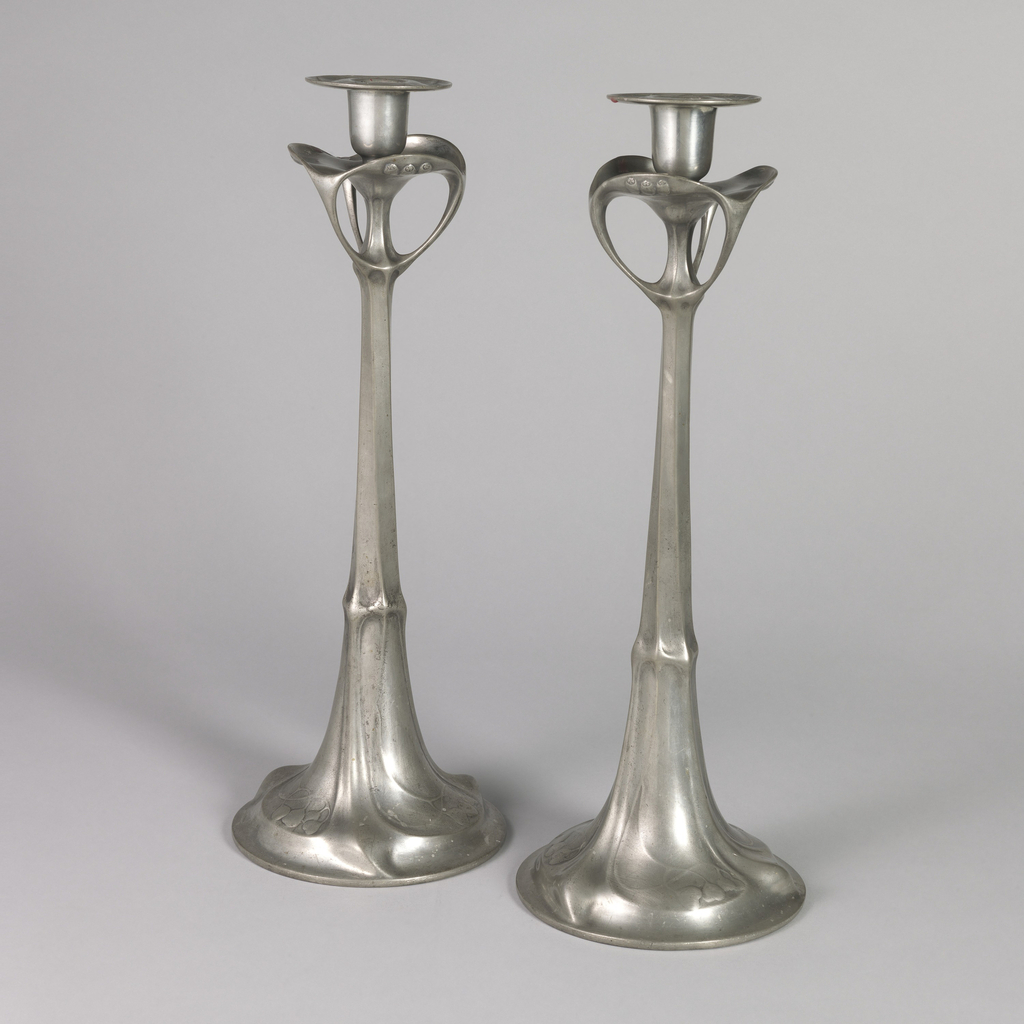 Candlestick Candlestick, 1900–1902; Designed by Hugo Leven (German, 1874-1956); Manufactured by J. P. Kayser & Sohn (Germany); pewter; H x diam.: 41.9 x 15.2 cm (16 1/2 in. x 6 in.); Gift of Gerald G. Stiebel and Penelope Hunter-Stiebel; 2013-49-2-c,d