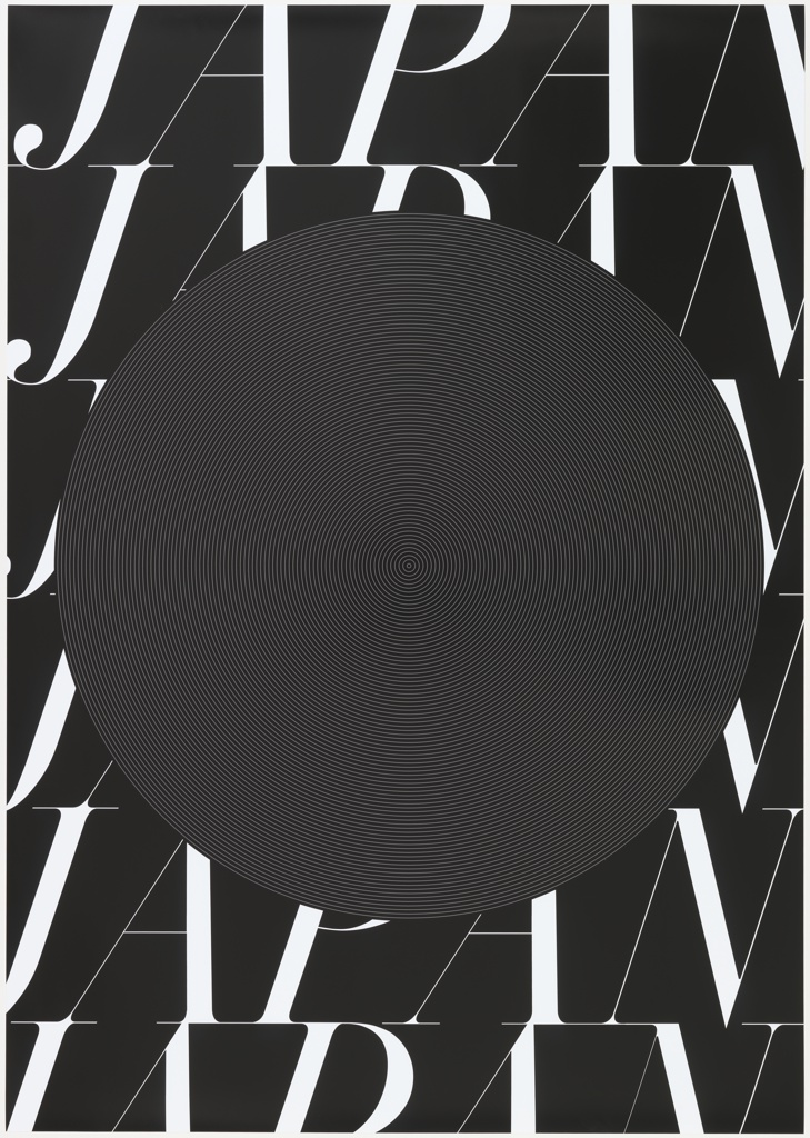 For a personal project, Shiro Shita Saori designed a pair of posters as an ode to Japan and the rich history of Japanese poster design. As Bruno Munari half-jokingly wrote, “[t]he old idea in advertising was that a poster should hit you in the eye.” The tradition of Japanese posters that feature an eye-catching circle in the center of their composition is often a nod to the country’s flag, which comprises a stark red circle on a white ground. Of this design structure, Munari wrote that “the disc itself is a form that the eye finds is hard to escape from.” Working within this esteemed tradition, Saori’s poster features the word "JAPAN" repeated six times in white italicized letters against a black ground. A central black circle obscures much of these letters, and is filled with thin white concentric circles, further drawing the eye to the center or, as Munari would say, hitting you in the eye.