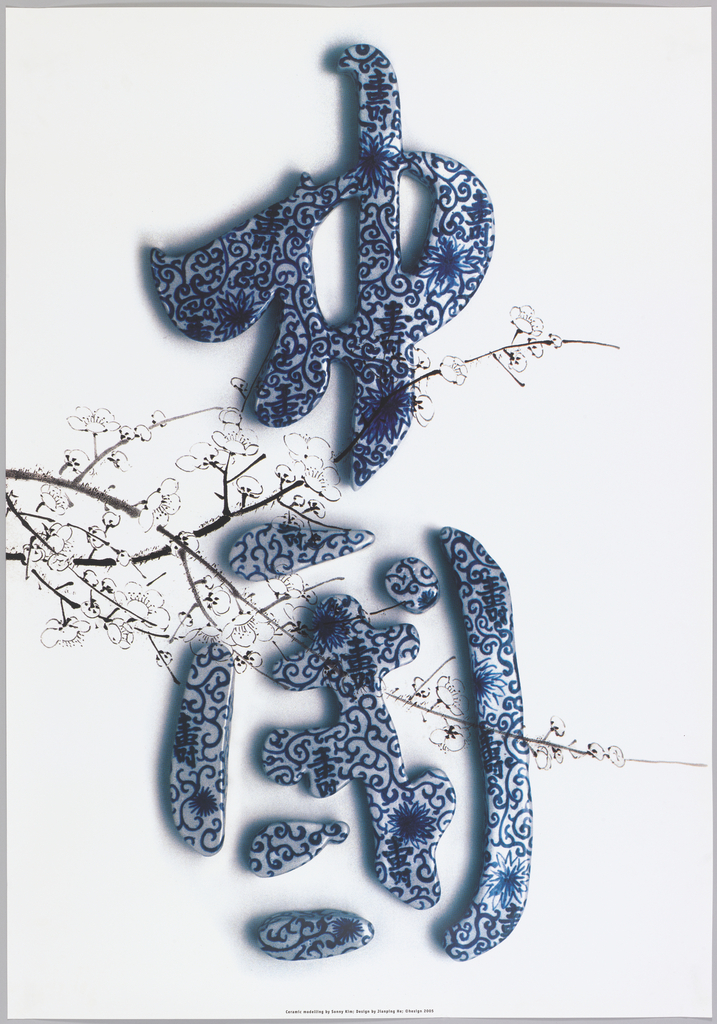 This poster, the earliest example of He’s work to be added to Cooper Hewitt’s collection, was designed for the Taiwan Poster Design Association. The poster features the two Chinese characters that together translate as "China." The characters were modelled in ceramic by artist Sonny Kim, and painted to recall the iconic blue and white floral pattern associated with the country. He staged these two ceramic models against a bough of white cherry blossoms.