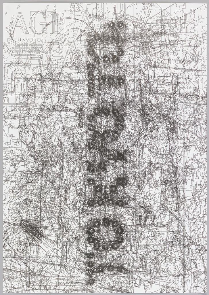On the occasion of their annual conference held in Kyoto in 2006, the Alliance Graphique Internationale (AGI) published a book entitled “To Kyo To”, featuring posters designed by 80 international AGI members. Jianping He designed the book, and created this delicately rendered poster to advertise the publication. He used a thin, free-flowing line that scribbles across the page and doubles back on itself to densely fill the space. The central textforms that make up the publication title, “To Kyo To”, are comprised of layers of concentric circles, as if the designer repeated his motions over and over with a ballpoint pen. The forms echo the punctured holes that make up the title on the cover of the publication itself.