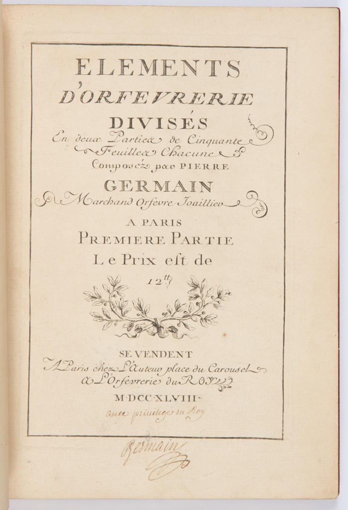 Printed center, in plate: ELEMENTS / D'ORFEVRERIE / DIVISÉS / En deux Parties de Cinquante / Feuilles Chacune / Composéz par Pierre / GERMAIN / Marchand Orfevre Joaillier / A PARIS / PREMIERE PARTIE / Le Prix est de / 12 tt / SE VENDENT / A Paris chez L'Auteur place du Carousel / A L'Orfevrerie du ROY / M.DCC.XLVIII; Inscribed in ink, lower center, in margin: Avec privilege du Roy / Germain