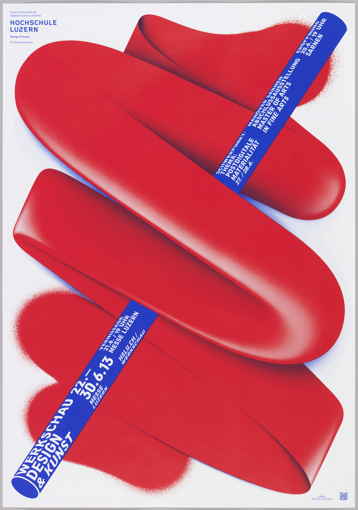 This poster promotes an annual showcase of student work at the Lucerne University of Design and Art, called the Werkschau, and was designed by Felix and Mathis Pfäffli, brothers who are both graphic designers based in Switzerland. To represent the multimedia exhibition, they designed a symbol of artistic transformation. Felix Pfäffli describes the poster’s enormous squiggle as the first stroke of the artist, which begins in the lower left as spray paint, before morphing into paper, then plastic, and then changing back to its original form in the top right. For designers in the digital age, media is endlessly malleable—a simple click can transform textures and materials. The squiggle is itself subject to digital transformation. Using design software, the Pfäfflis simulated shadows and highlights, giving it the appearance of dimensionality. Printed in bright red, their squiggle is volumetric and a bit voluptuous. As Pfäffli explains, "A brushstroke isn’t just a stroke anymore. It can be whatever you want."