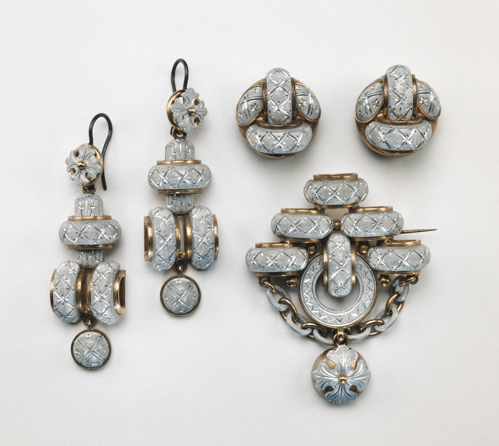 This is a Jewelry suite. It is dated ca. 1860 and we acquired it in 1928. Its medium is bright-cut engraved aluminum, gold. It is a part of the Product Design and Decorative Arts department.