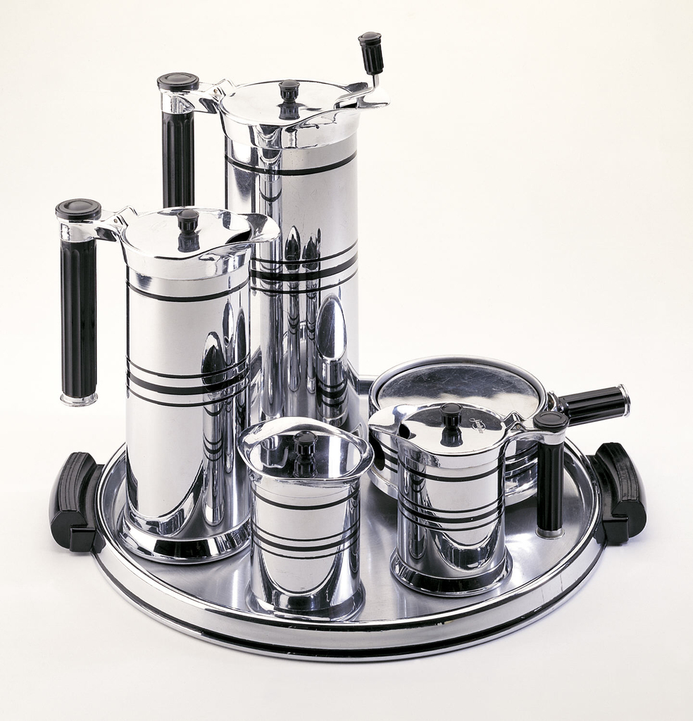 Coffee Maker; chrome-plated metal, enamel; (tray): 2.5 x 37.5 x 32.5 cm (1 in. x 14 3/4 in. x 12 13/16 in.) (coffee maker): 29.5 x 17.3 x 10 cm (11 5/8 x 6 13/16 x 3 15/16 in.) (hot plate): 5.8 x 17.6 x 11.2 cm (2 5/16 x 6 15/16 x 4 7/16 in.) (teapot): 19.4 x 15.3 x 8.5 cm (7 5/8 in. x 6 in. x 3 3/8 in.) (sugar bowl): 9.4 x 8.6 x 7.4 cm (3 11/16 x 3 3/8 x 2 15/16 in.) (creamer): 9.6 x 12.2 x 7 cm (3 3/4 x 4 13/16 x 2 3/4 in.); Museum purchase from Decorative Arts Association Acquisition Fund; 1993-150-44-b,c